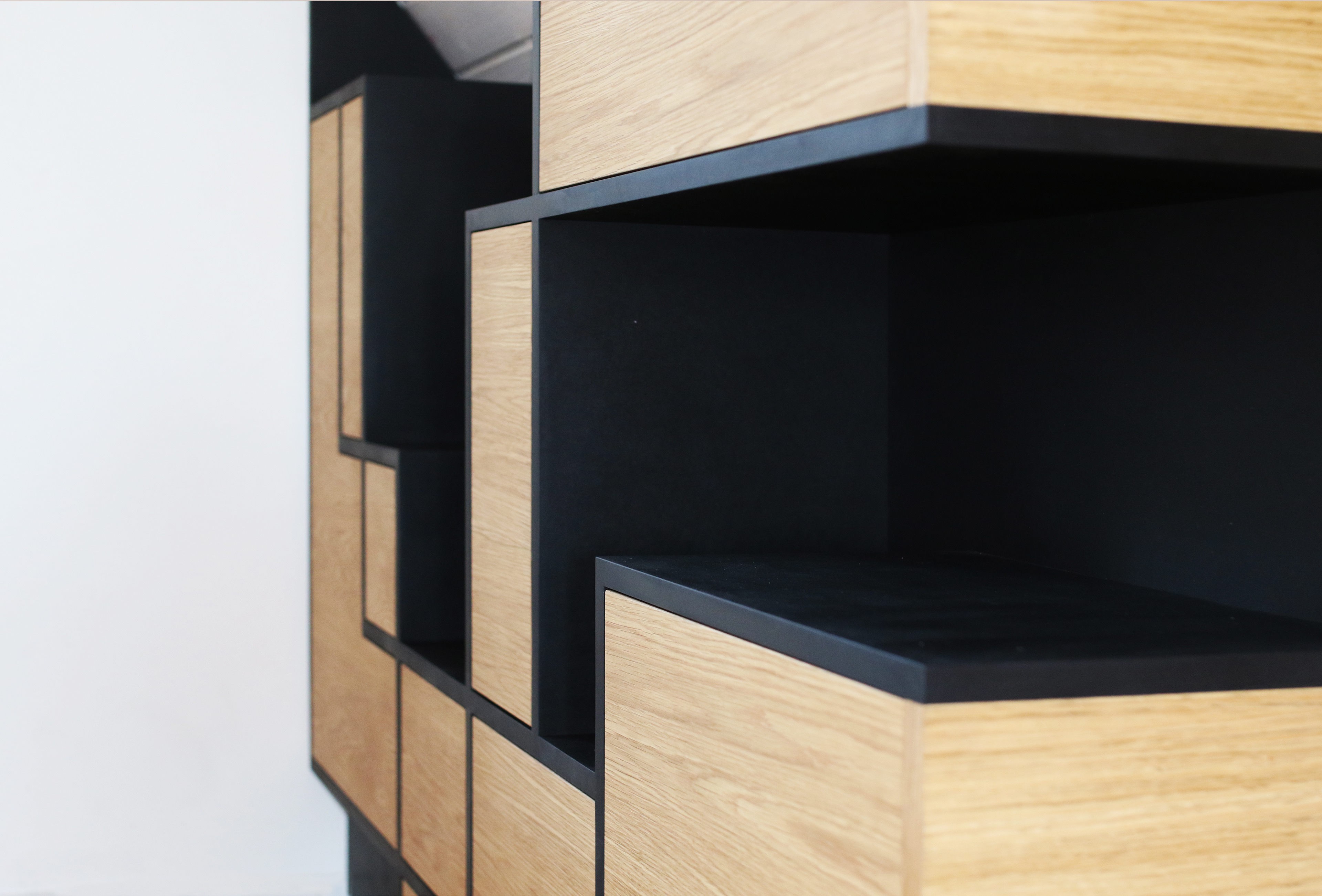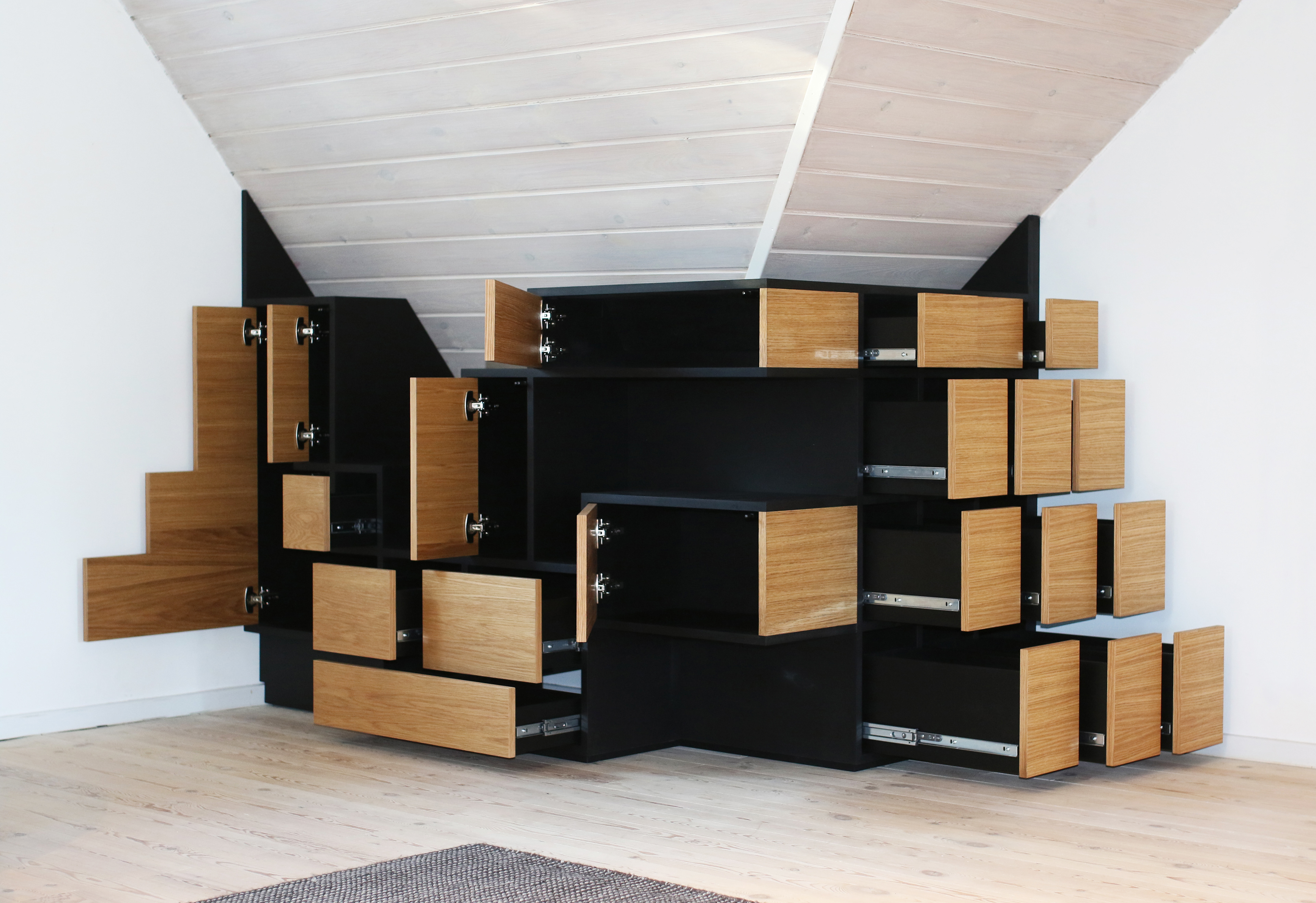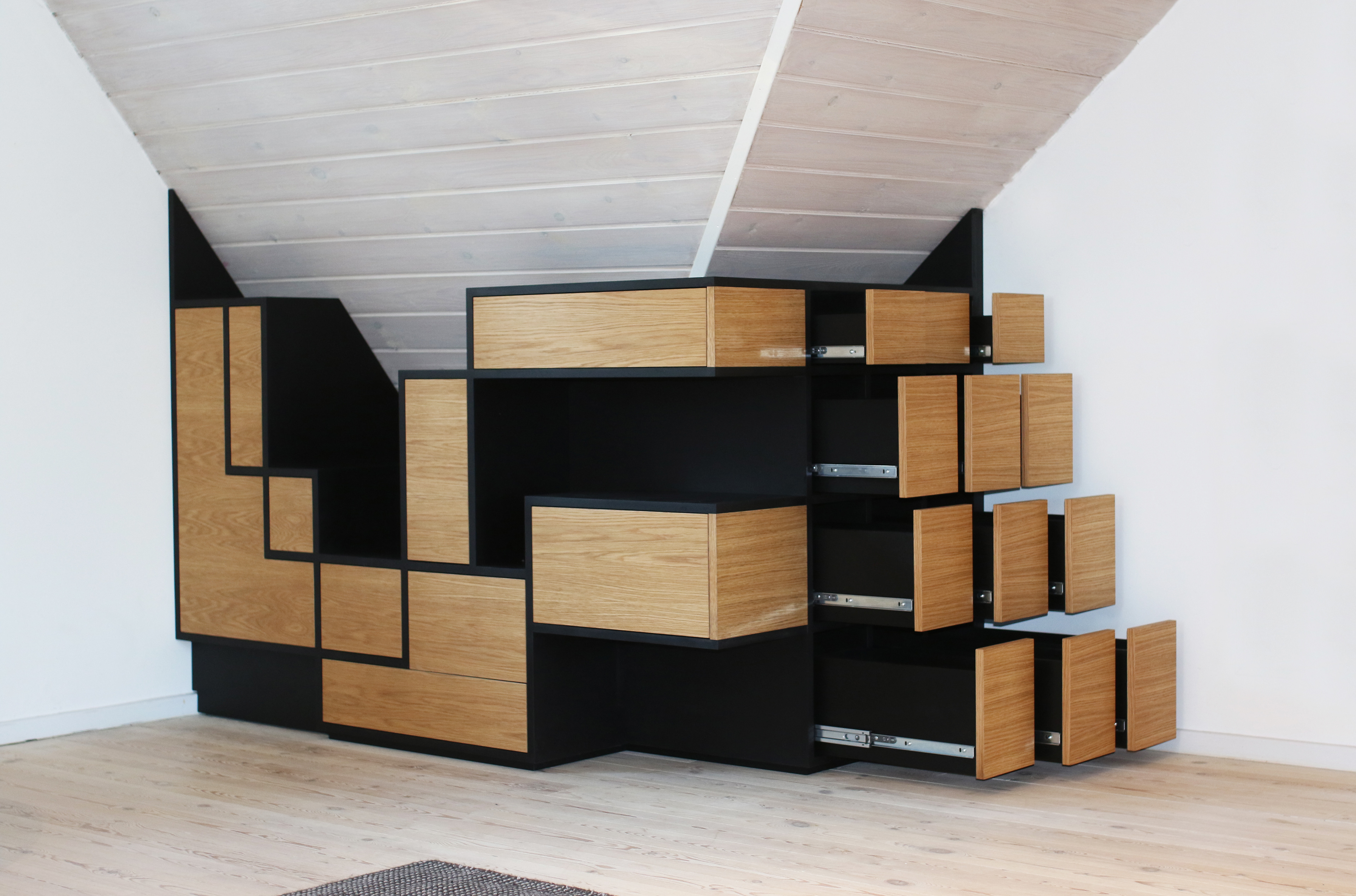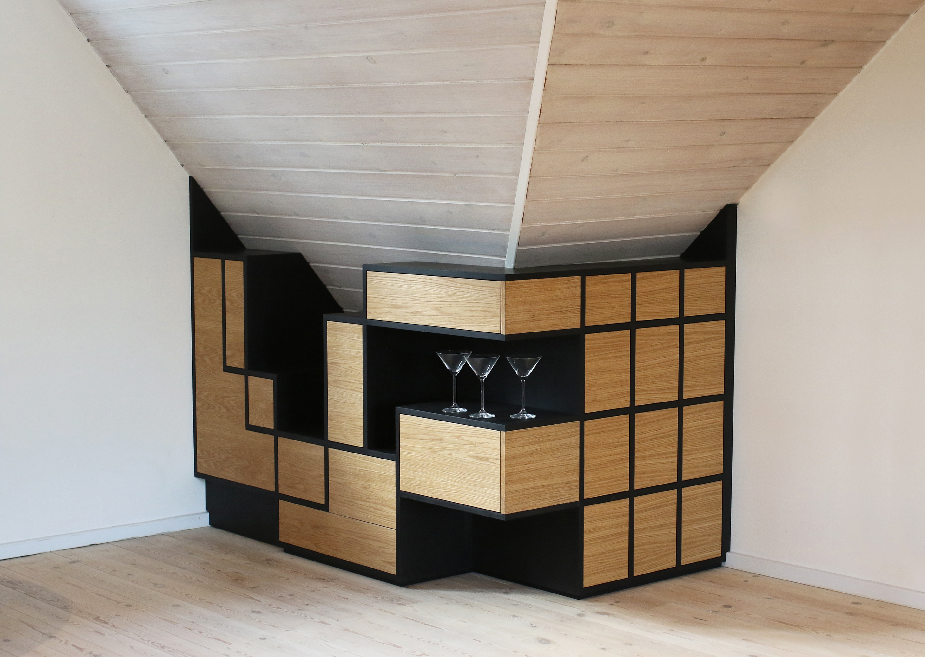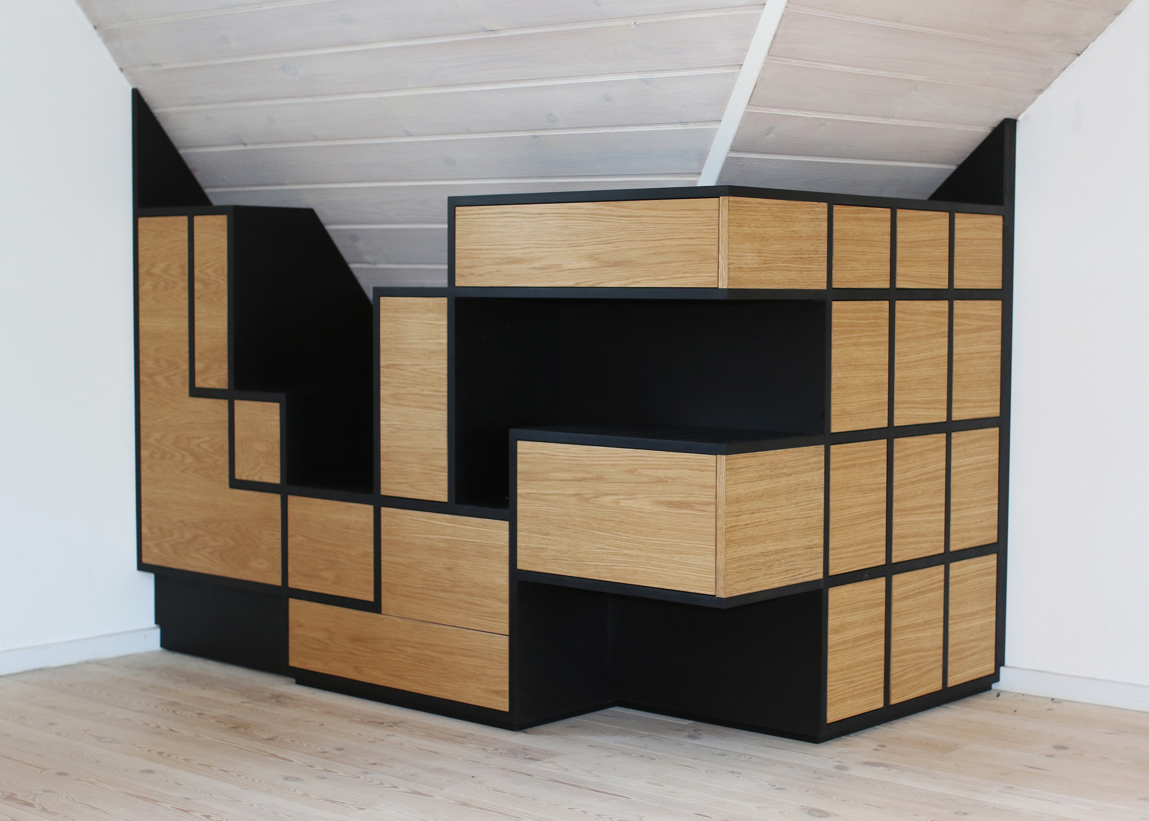 Design and production of a one-off storage unit for a Danish country house. The cabinet’s design is derived from the angular shape of the walls and the necessity of creating several individual storage spaces.